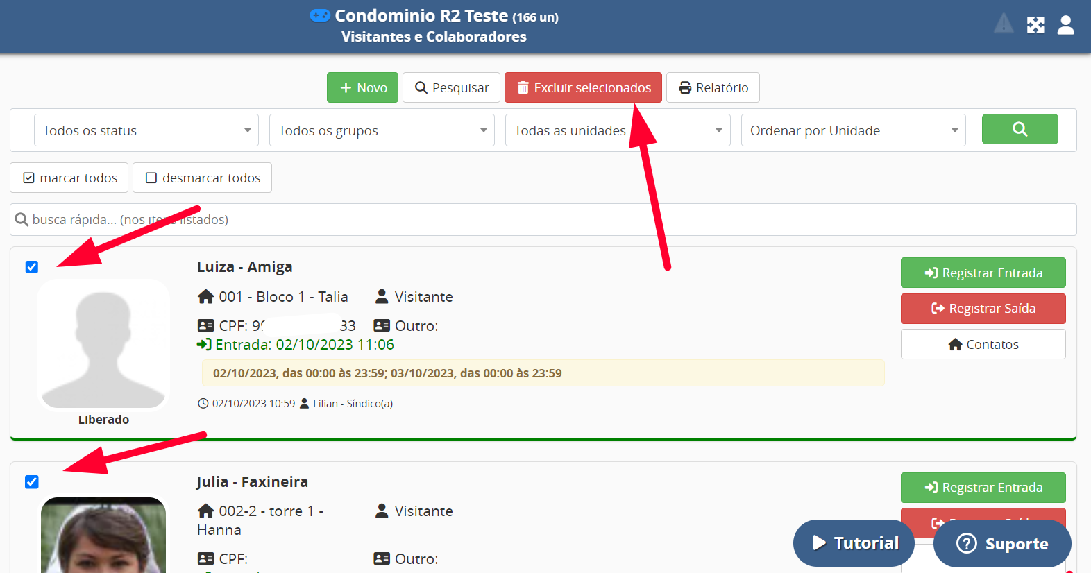 Excluir Selecionados para selecionar a quantidade de visitantes desejado na caixa de seleção ao lado dos cadastros, e depois efetuar a exclusão;