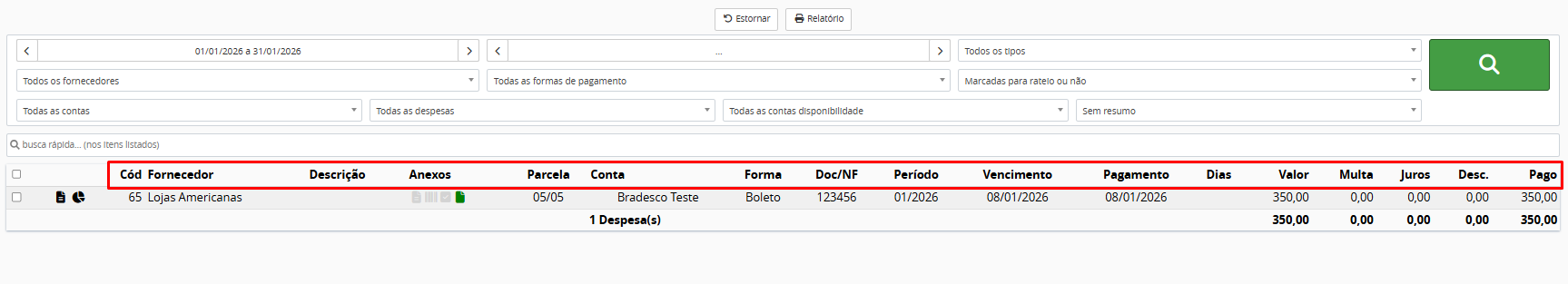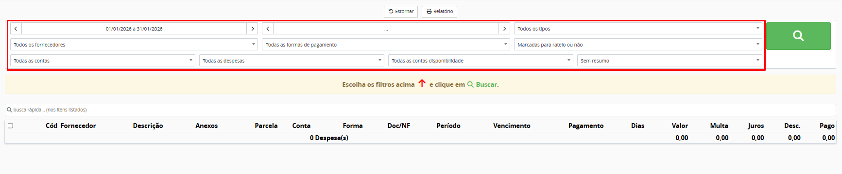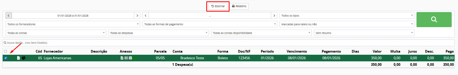 - Caso deseje estornar alguma despesa, selecione a despesa da listagem e clique em Estornar, no topo da tela;