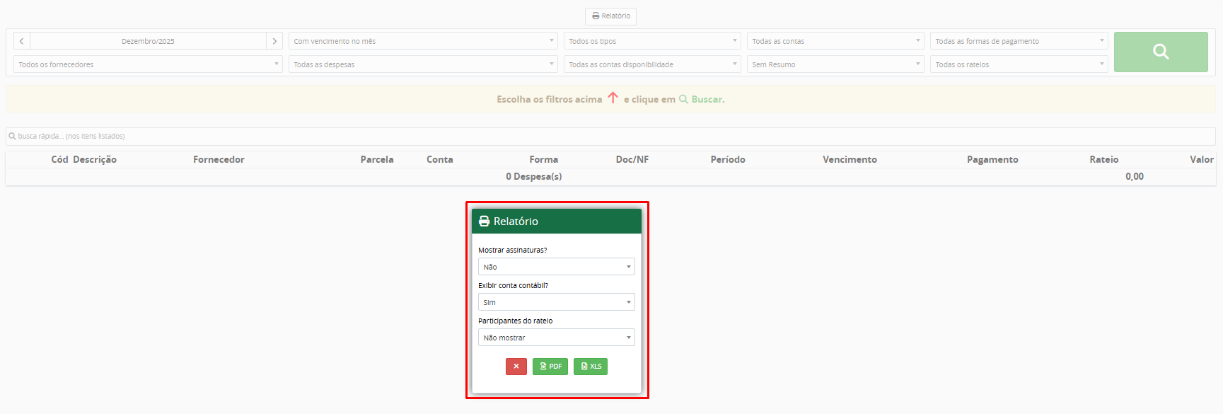 2.7 Todas as despesas: determine se deseja visualizar todas as despesas ou apenas de uma conta contábil específica;
