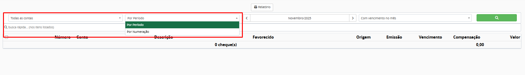 2.2 Período ou Numeração do Cheque: selecione Por Período e informe o intervalo desejado, ou escolha Por Numeração do Cheque;