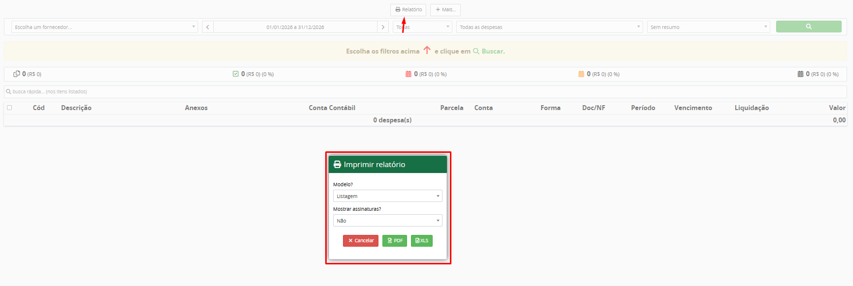 3. Visualizar resultados: A listagem exibirá as principais informações das despesas, como descrição, conta bancária, forma de pagamento, vencimento, liquidação e valor; 4. Gerar relatório: Clique em Relatório e escolha incluir ou não assinaturas cadastradas; selecione o modelo desejado (listagem ou detalhado) e o formato (PDF ou XLS);