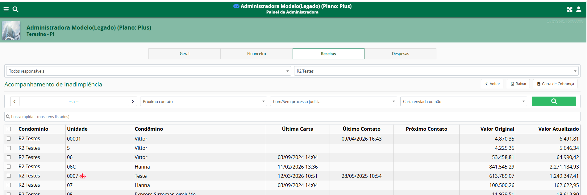 Ao clicar na sessão, será possível filtrar por período, por Último Contato ou Próximo Contato, por Unidade com ou sem processo judicial e por Carta de cobrança enviada ou não. Com isso, o sistema mostrará o condomínio, a unidade, o nome do condomínio, o último contato realizado e qual a data do próximo contato a ser feito. Mostrará também o valor total original das cobranças vencidas, o valor total atualizado da inadimplência e a data da última carta de cobrança enviada.