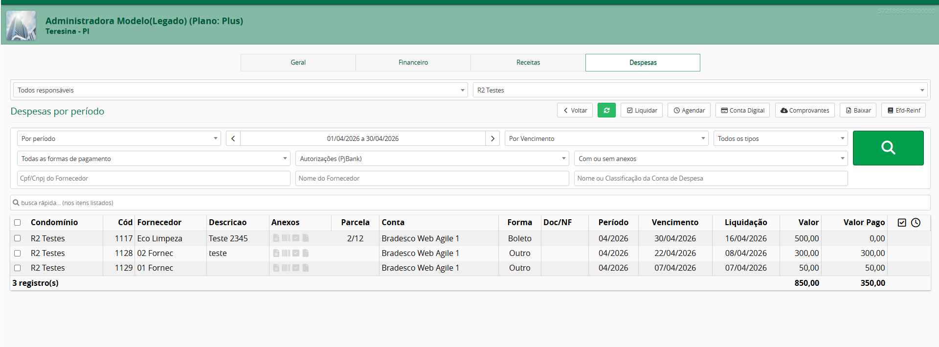 Filtrando nessa tela, verá a listagem de condomínios e suas respectivas despesas.