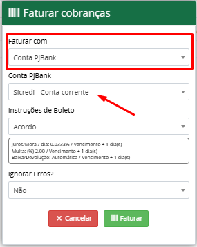 2.1 Faturar com: Escolha entre Conta Bancária ou Conta PJBank;