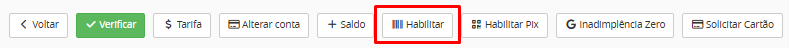 - Caso a plataforma informe que a conta escolhida não está habilitada, siga o caminho: Geral > Contas PJBank > Contas PJBank > selecionar a conta > Habilitar.