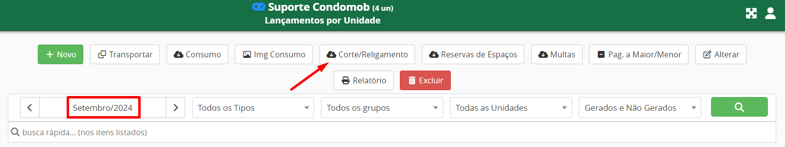 Na tela inicial da função, será preciso filtrar o mês de competência da cobrança que será gerada e, após isso, clicar em Corte/Religamento.