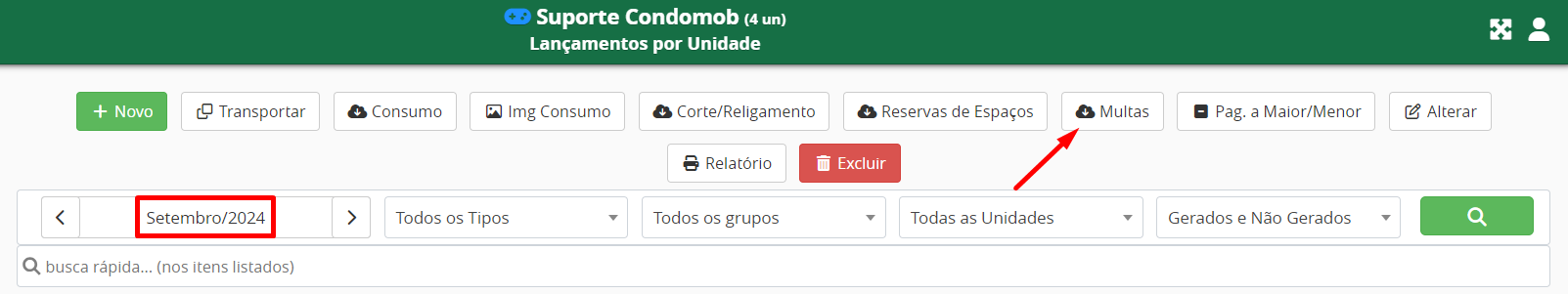 Na tela inicial da função, será preciso filtrar o mês de competência da cobrança que será gerada e, após isso, clicar em Multas.