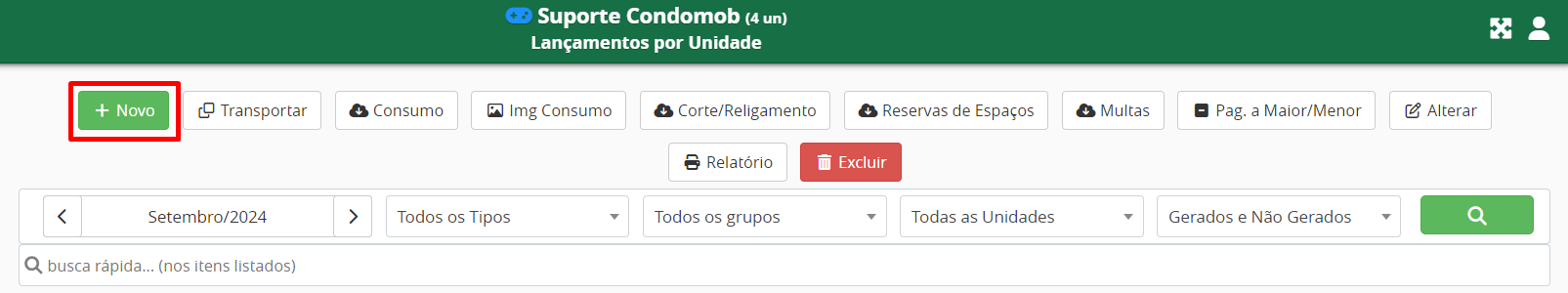 Para inserir um novo lançamento individual, escolha um período e clique no botão +Novo.